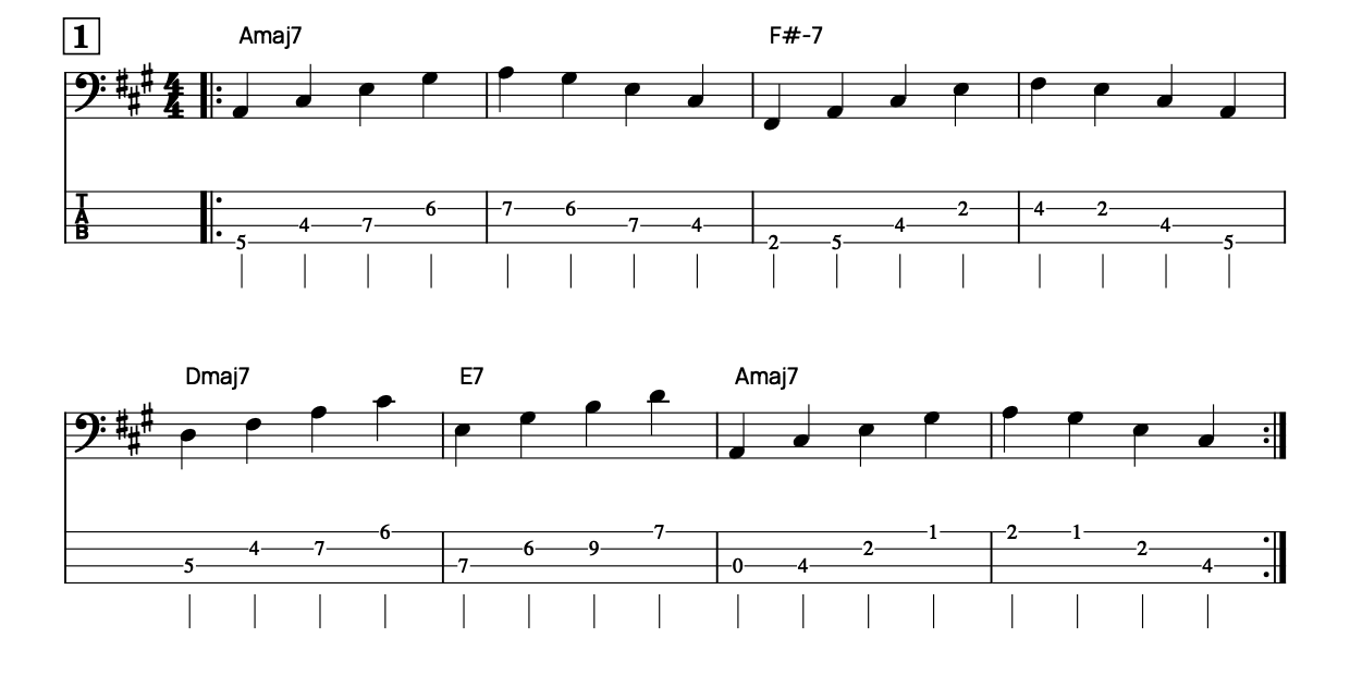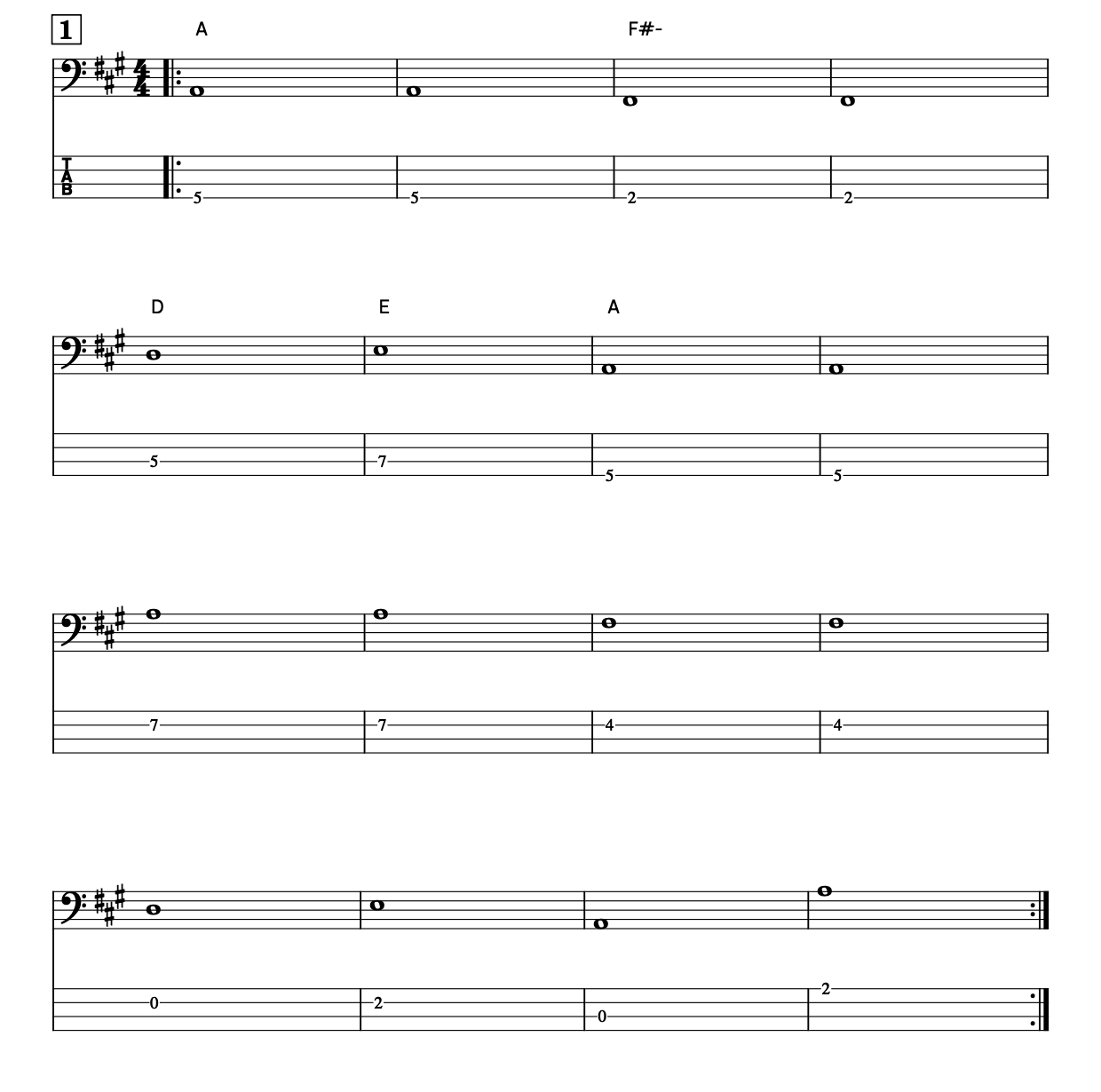 Wir starten mit den Grundtönen der Akkorde. Wenn du noch ganz am Anfang von deiner Bass Karriere bist, kannst du hier auch gleich die Töne auf dem Griffbrett lernen.