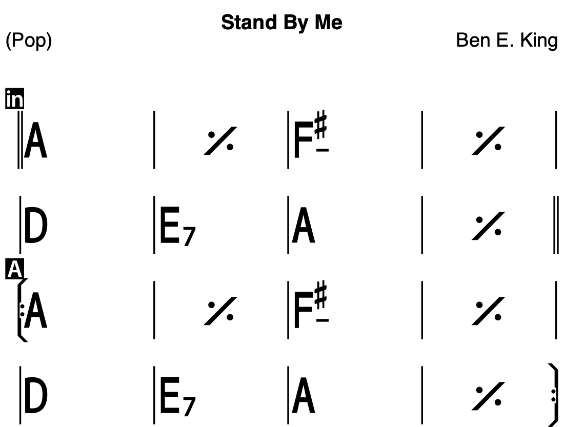 Zum Üben gibt es hier die Akkordfolge von “Stand By Me” in G-Dur. Du musst jetzt alles einen Ganzton tiefer spielen und kannst natürlich alle Übungen von oben auch gleich nach G-Dur transponieren.