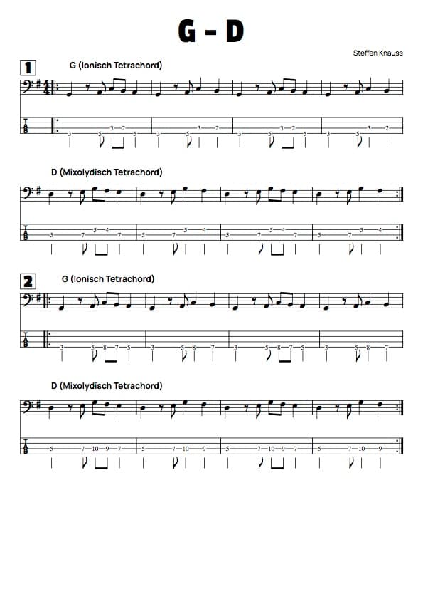 Damit du die Idee mit den Tetrachords auch gleich in einer Bassline auf dem Bass üben kannst, hab ich dir zwei Beispiele im Bassschlüssel und als TAB notiert.